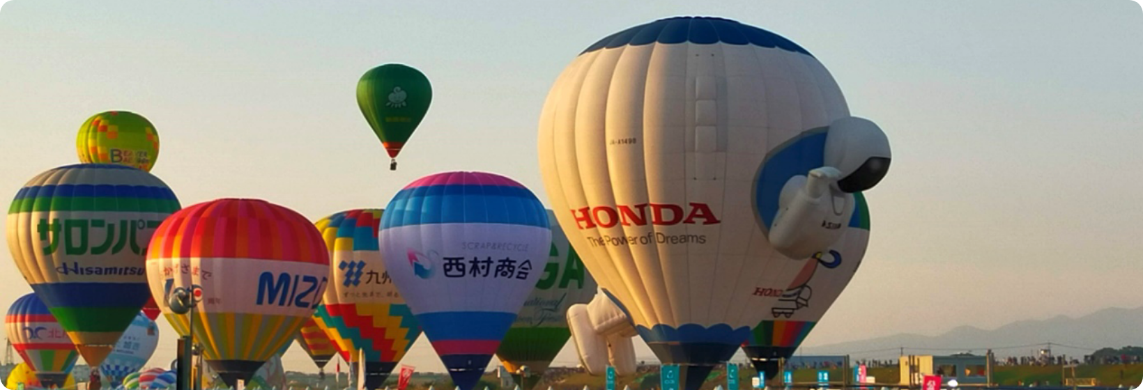 佐賀バルーンフェスタは、熱気球というスポーツの普及と、地域の観光振興を促進することを目的に10月下旬から11月初旬に実施されている世界的な熱気球競技大会です。1980年に第1回が開催されて以来、45年続いている長い歴史を持つイベントであり、佐賀県を代表する観光イベントの一つです。このイベントには、毎年約50万人以上の来場者が訪れ、国内外から熱気球を愛する多くのファンが集まります。イベントでは、世界中から集まった熱気球が空を彩り、競技やフライト体験、夜間の光のショーなどさまざまなプログラムが実施され県民に最も愛されているイベントです。当社も佐賀に拠点を持つ企業として地域を盛り上げるべく、毎年協賛しております。